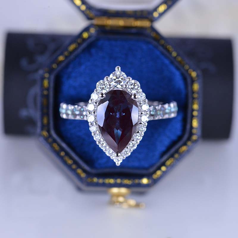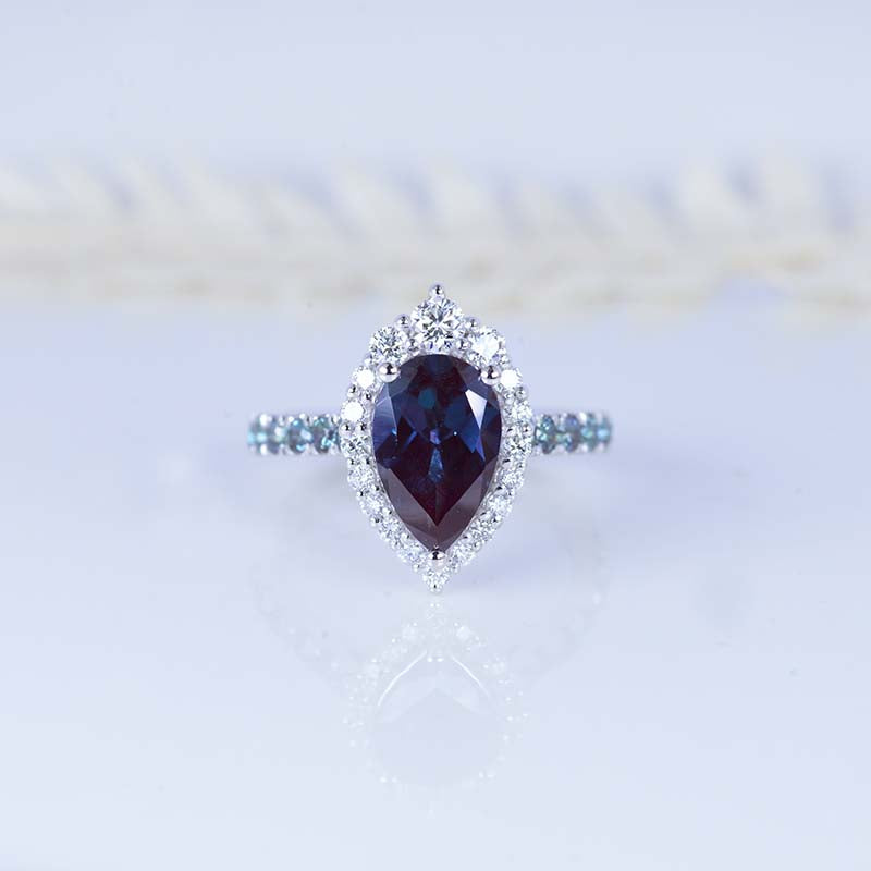 The default design option features 3 Carat 11x7mm Ethically Lab-Grown Pear Alexandrite Center Stone VVS1-Clarity, VG-Cut, Ex-Polish, VG-Symmetry
