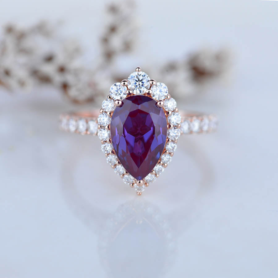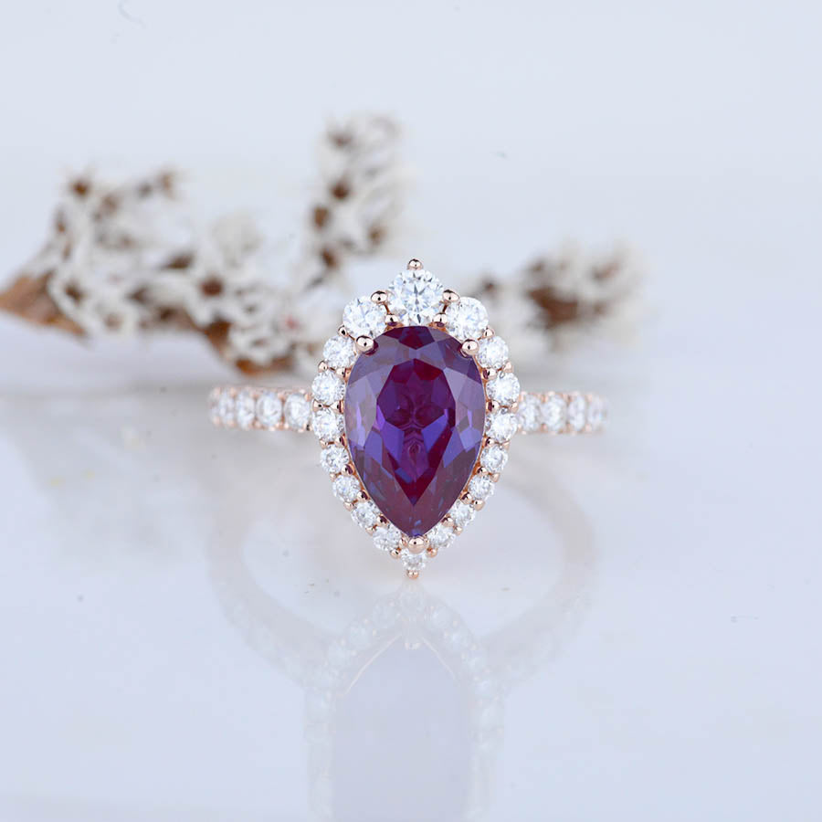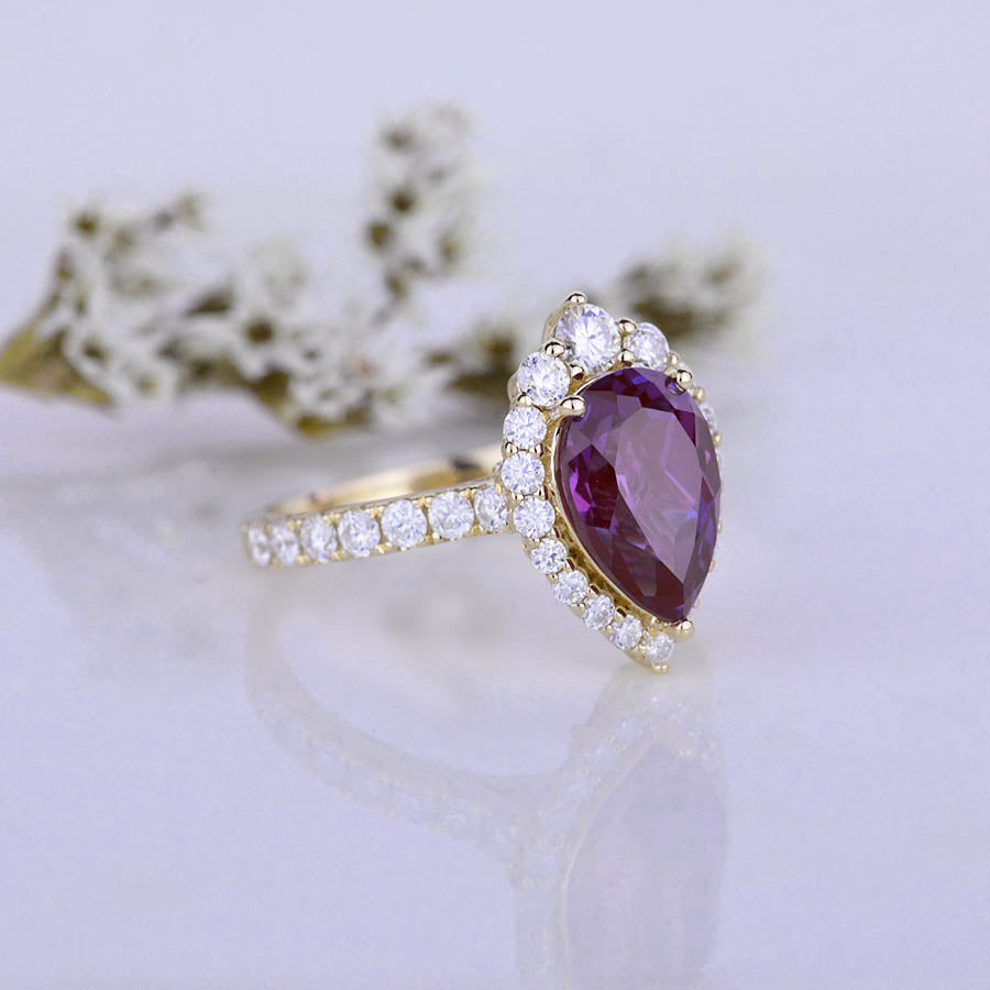 14K Solid White Gold 3 Carat Alexandrite Pear Cut Halo Moissanite Ring
