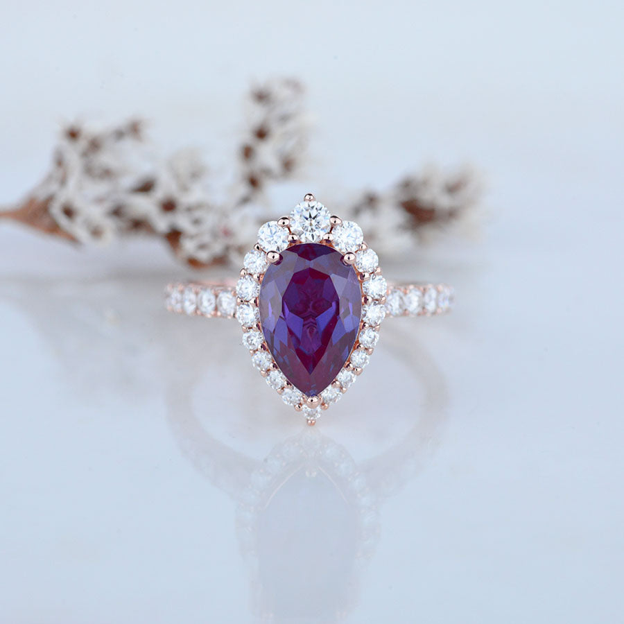 The default design option features 3 Carat 11x7mm Ethically Lab-Grown Pear Alexandrite Center Stone VVS1-Clarity, VG-Cut, Ex-Polish, VG-Symmetry