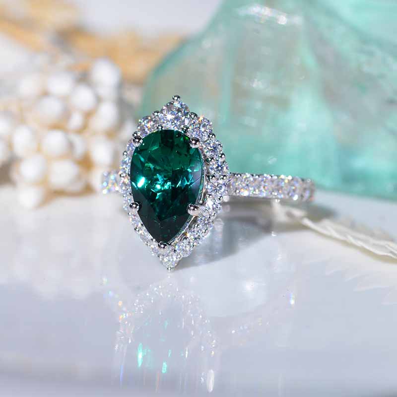 The default design option features 3 Carat 11x7mm  Pear Ethically Lab-Grown  Emerald  Center Stone, Grade AAAA VG-Cut, Ex-Polish, VG-Symmetry Set With D-Colorless Moissanite Accents