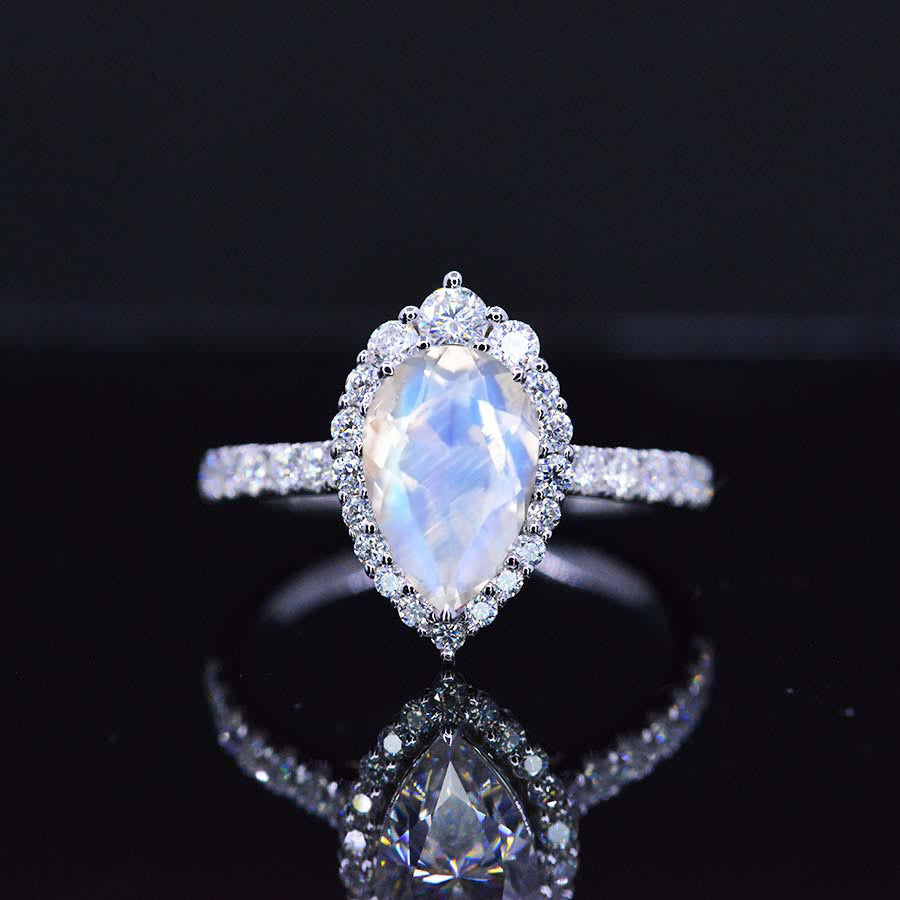 14K Solid White Gold 3 Carat Genuine Moonstone Pear Cut Halo Genuine moonstone Ring