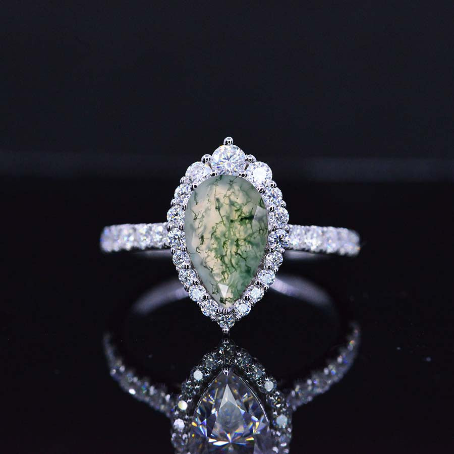14K Solid White Gold 3 Carat Genuine Moss Agate Pear Cut Halo Moissani - Giliarto