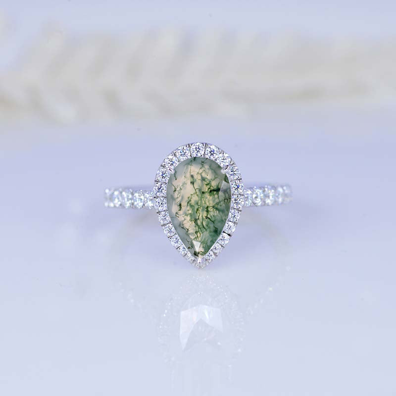 14K Solid White Gold 3 Carat Halo Pear Cut Genuine Moss Agate Ring Mod - Giliarto