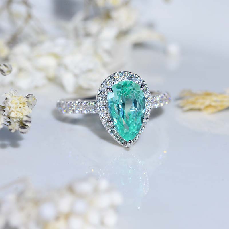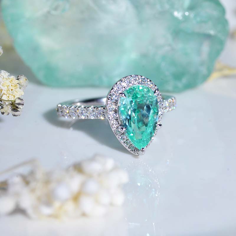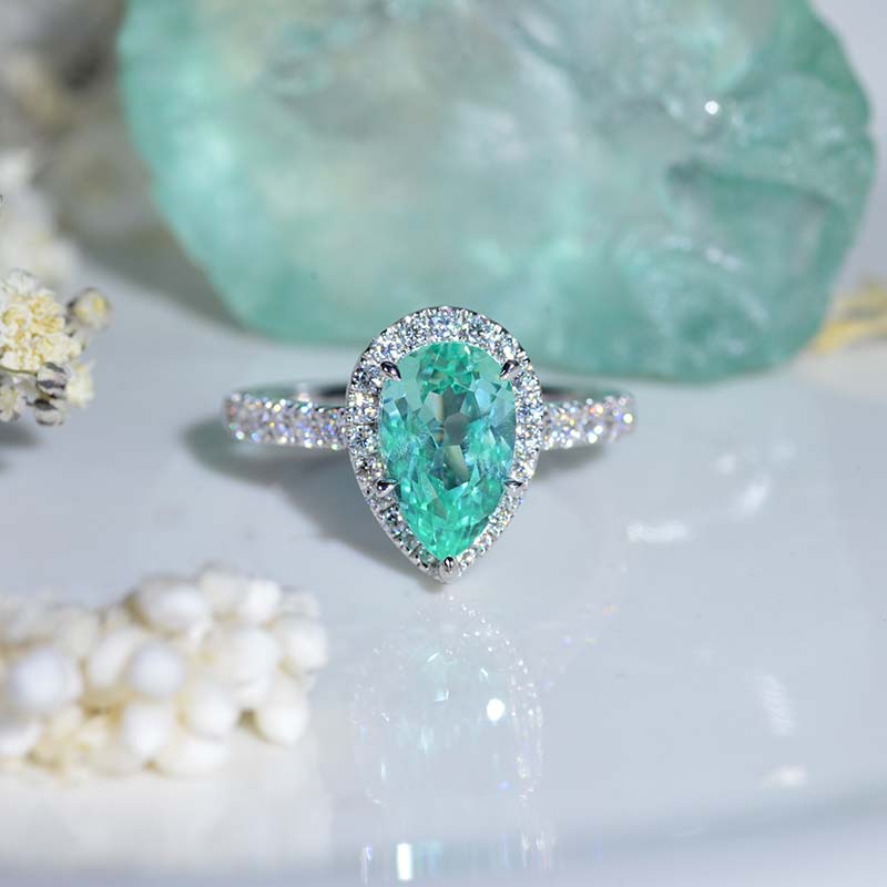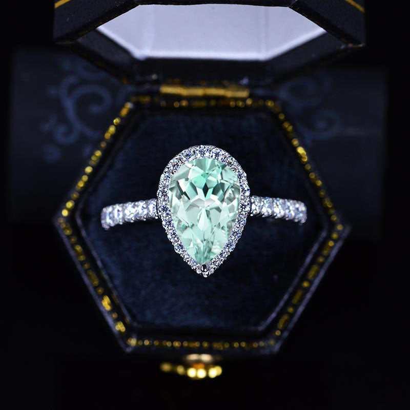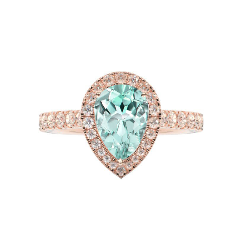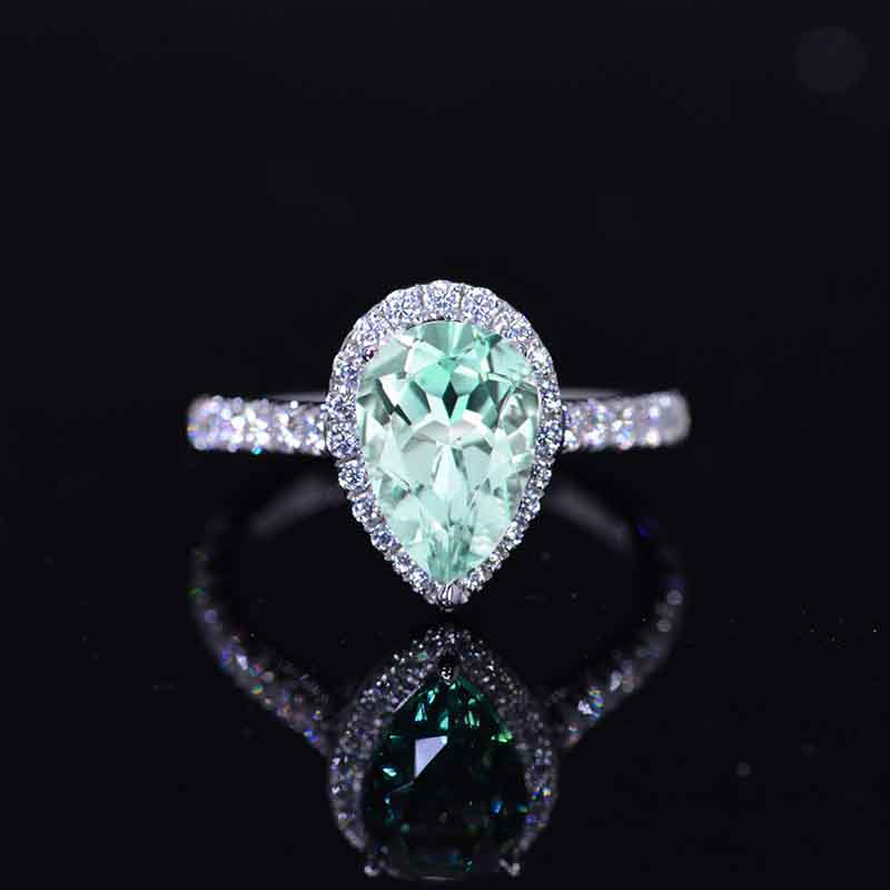 The default design option features 3 Carat 11x7mm Pear Center Ethically LAB-Grown Mint Sapphire Center Stone VVS1-Clarity, VG-Cut, Ex-Polish, VG-Symmetry set with D-Colorless Moissanite
