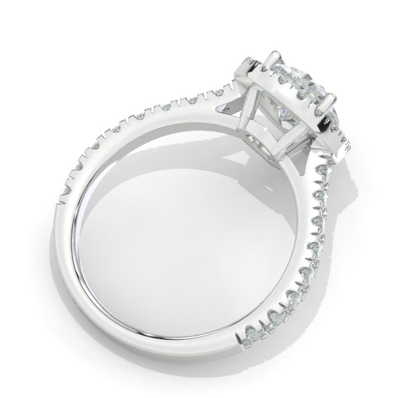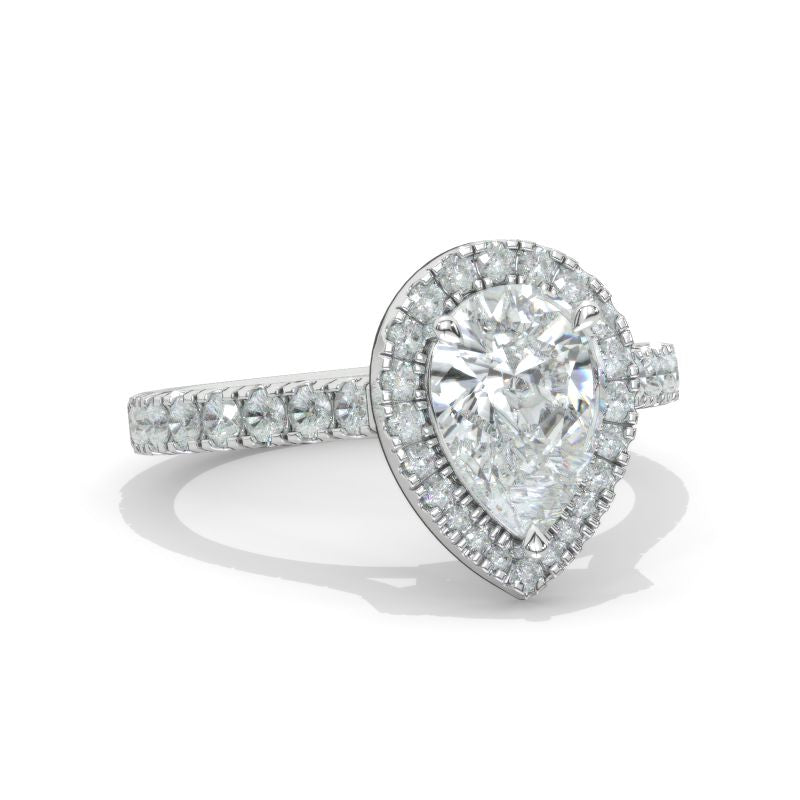 The default design option features 3 Carat 11x7mm Pear Center Moissanite Center Stone D-Colorless, VVS1-Clarity, VG-Cut, Ex-Polish, VG-Symmetry set with Moissanite Accent Stones D-Colorless, VVS1-Clarity,Â