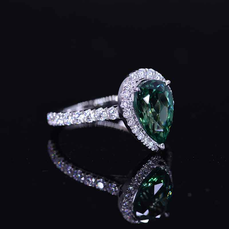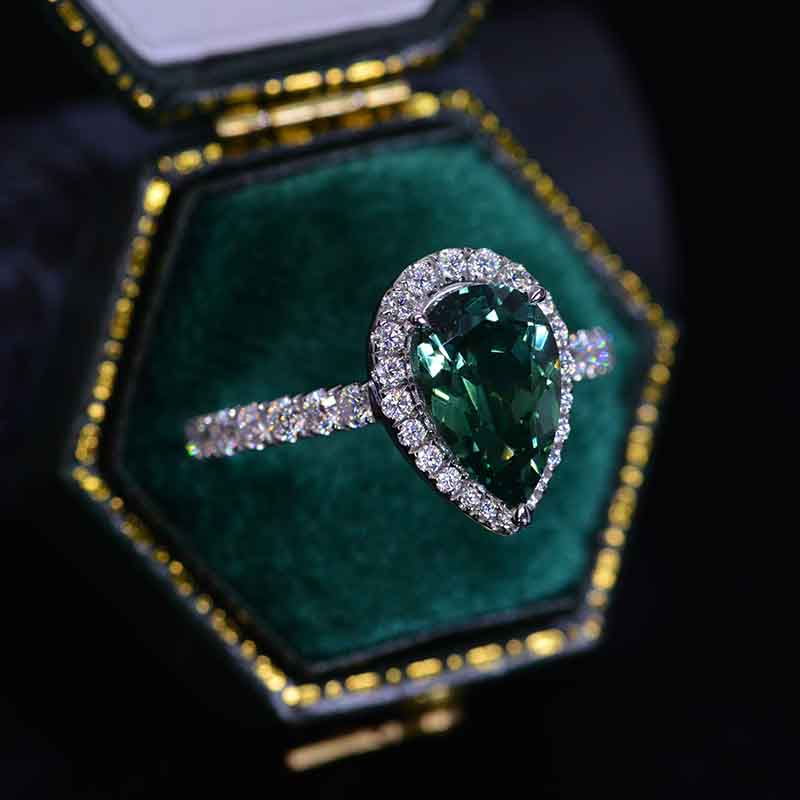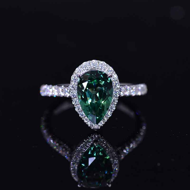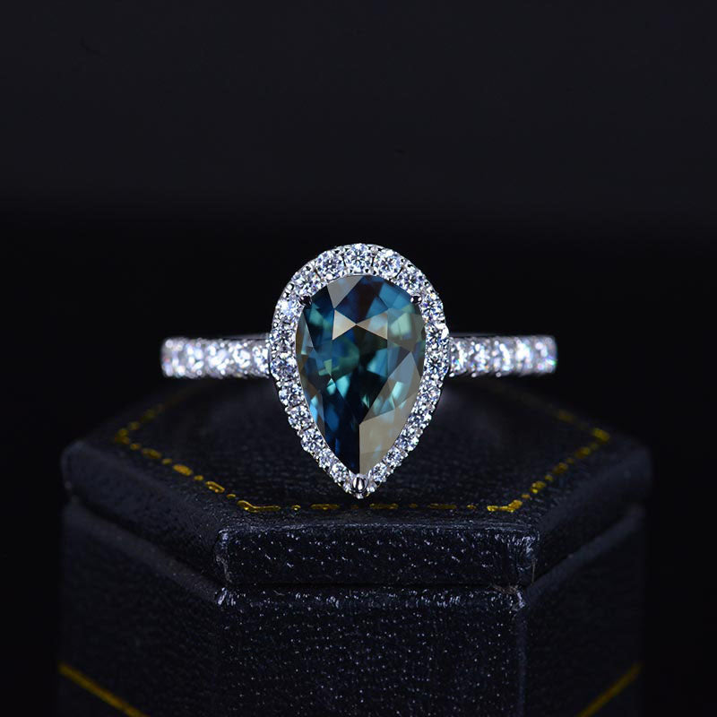 The default design option features 3 Carat 11x7mm Pear Center Ethically LAB-Grown Teal Sapphire Center Stone VVS1-Clarity, VG-Cut, Ex-Polish, VG-Symmetry set with D-Colorless Moissanite