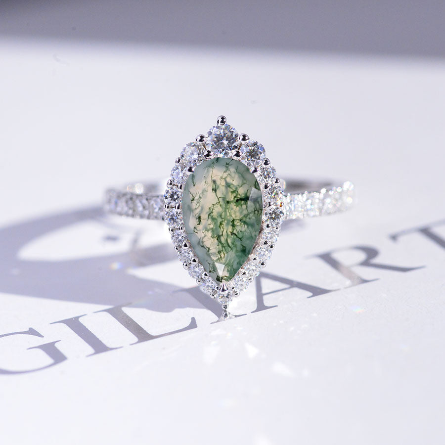 14K Solid White Gold 3 Carat Moss Agate Pear Cut Halo Moissanite Ring - Giliarto