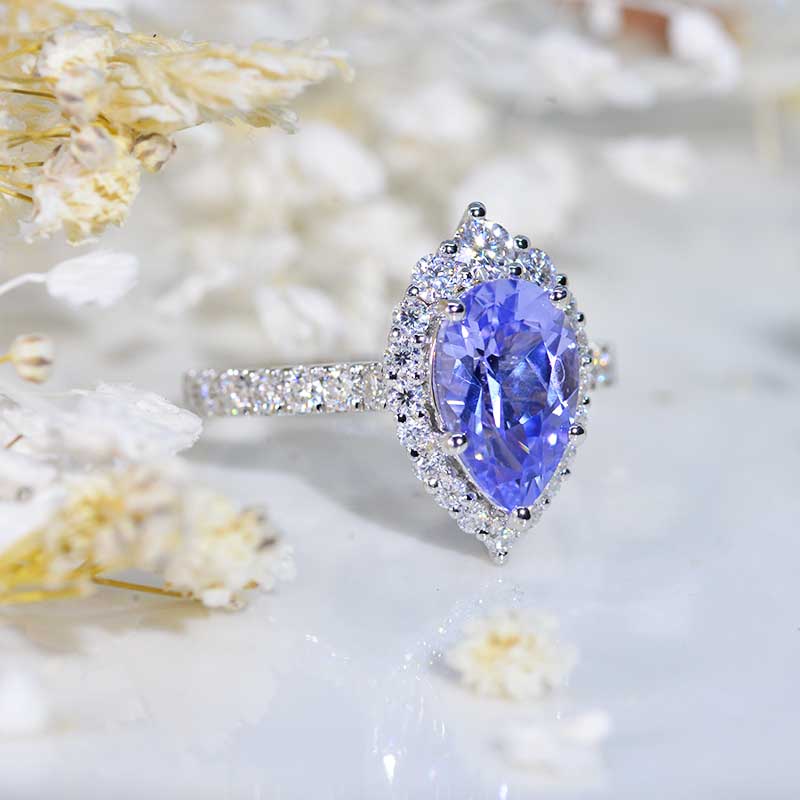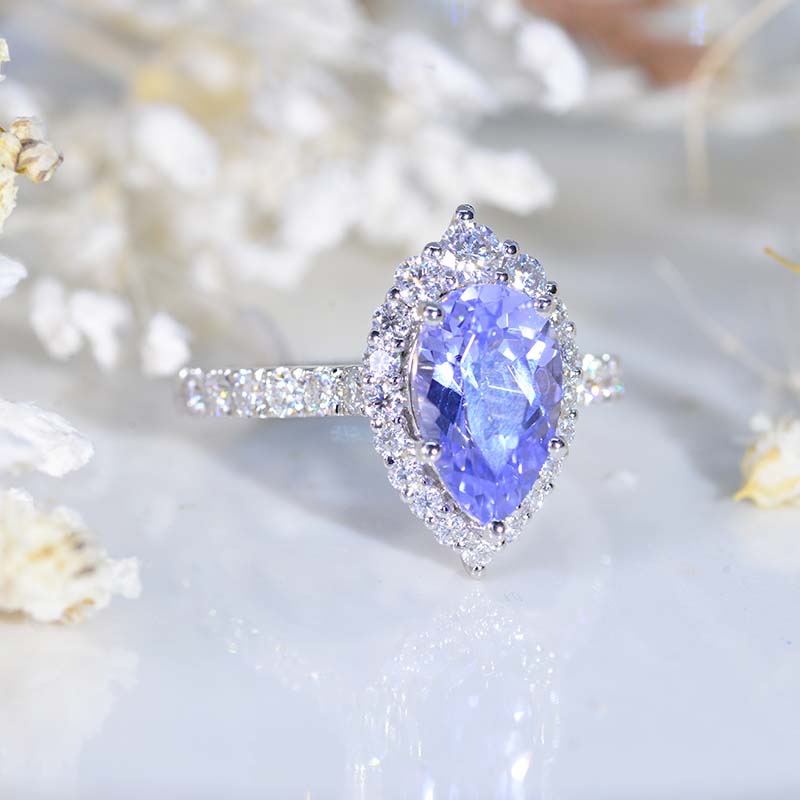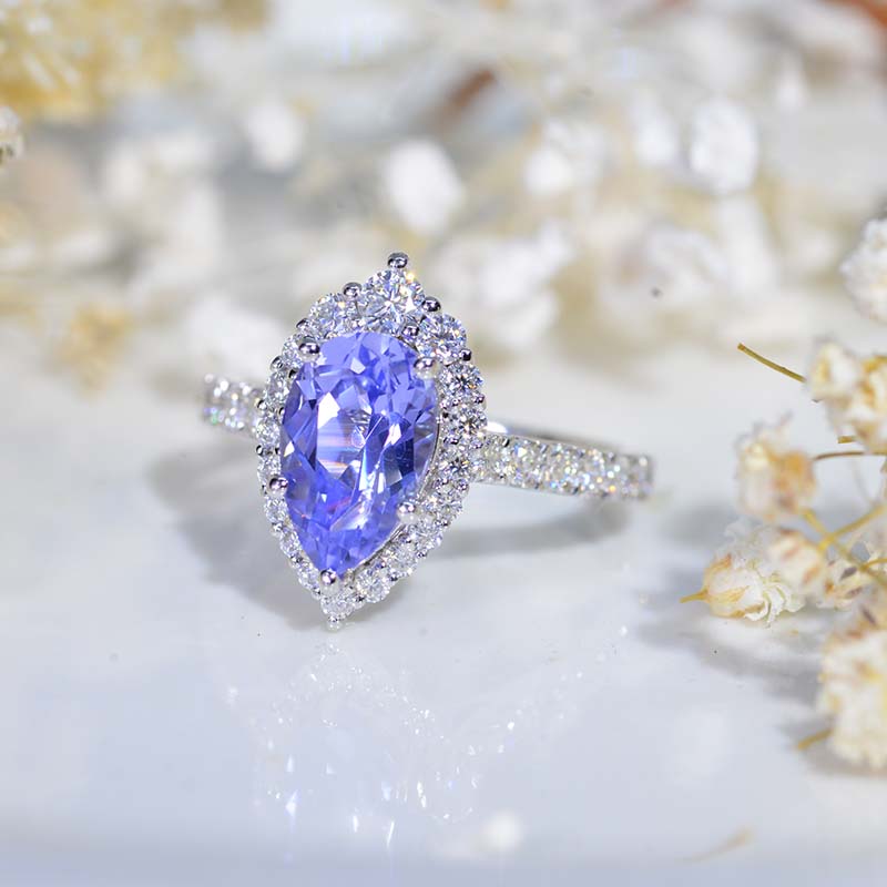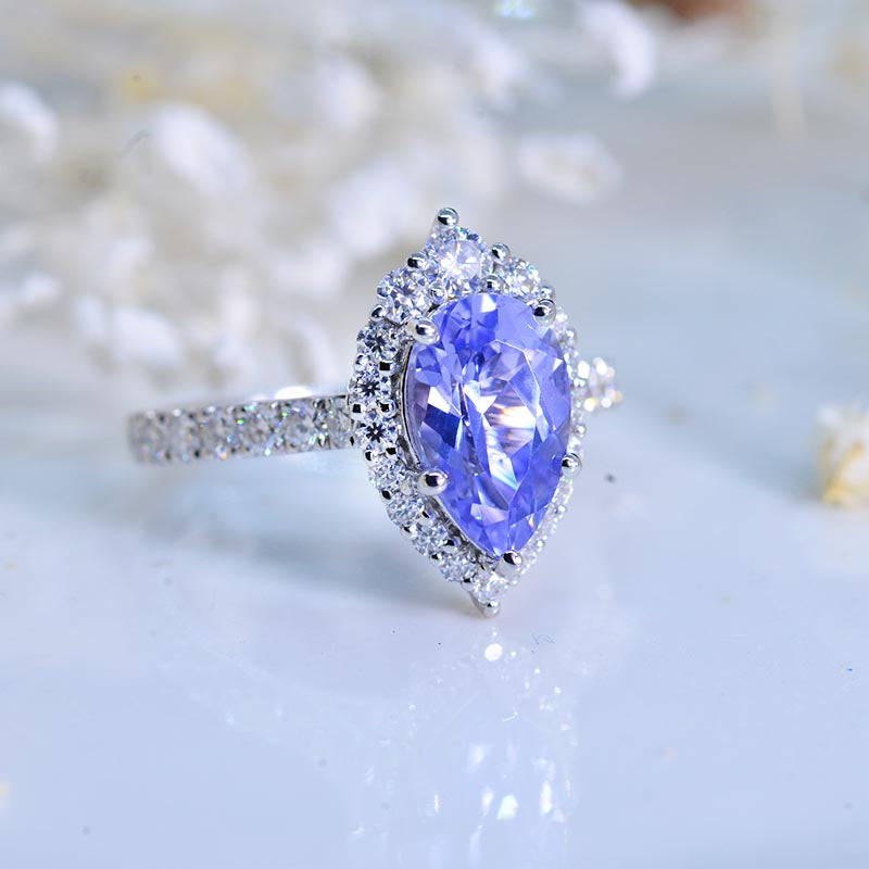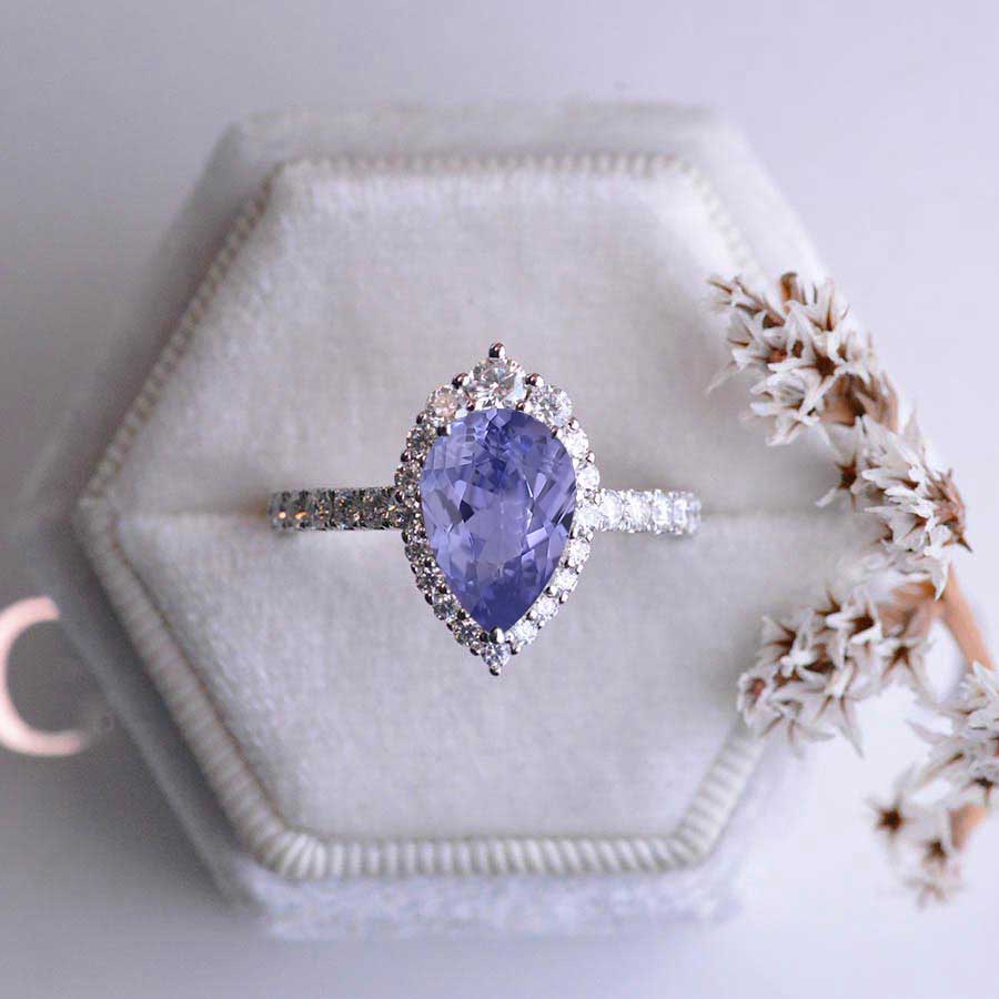 14K Solid White Gold 3 Carat Purple Sapphire Pear Cut Halo Purple Sapphire Ring