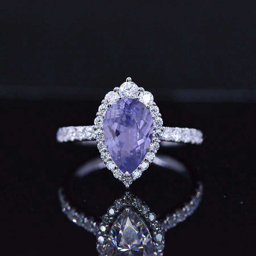 The default design option features 3 Carat 11x7mm Pear Center Ethically LAB-Grown Purple Sapphire Center Stone VVS1-Clarity, VG-Cut, Ex-Polish, VG-Symmetry