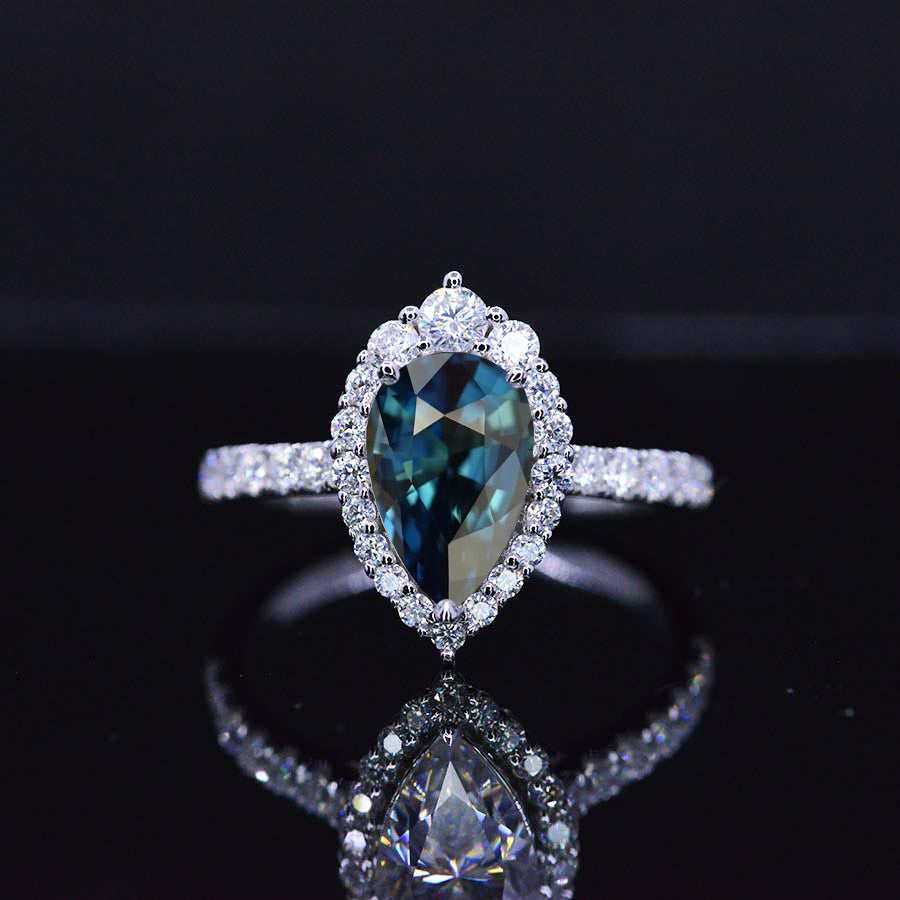 The default design option features 3 Carat 11x7mm Pear Center Ethically LAB-Grown Teal Sapphire Center Stone VVS1-Clarity, VG-Cut, Ex-Polish, VG-Symmetry
