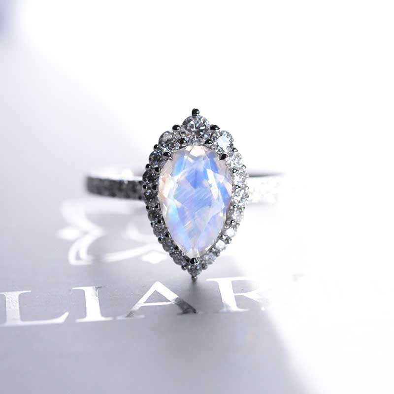 14K Solid White Gold 3 Carat Natural Moonstone Pear Cut Halo Natural Moonstone Ring