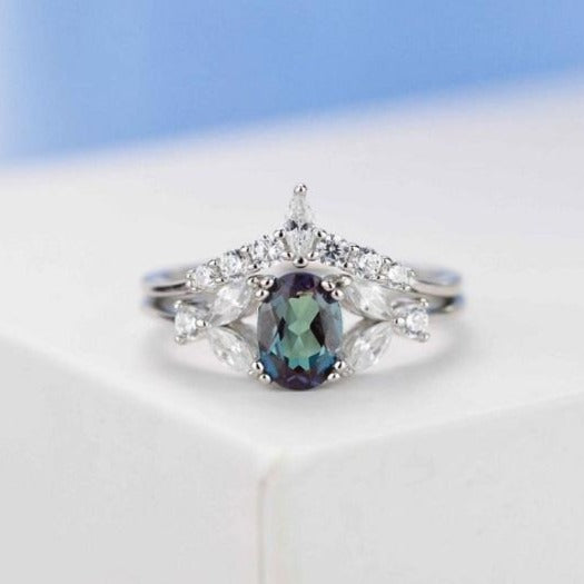 14K Solid White Gold Dainty Alexandrite Ring, Oval Cut Alexandrite Ring Set, White Gold Ring Unique Vintage Ring