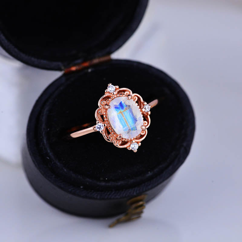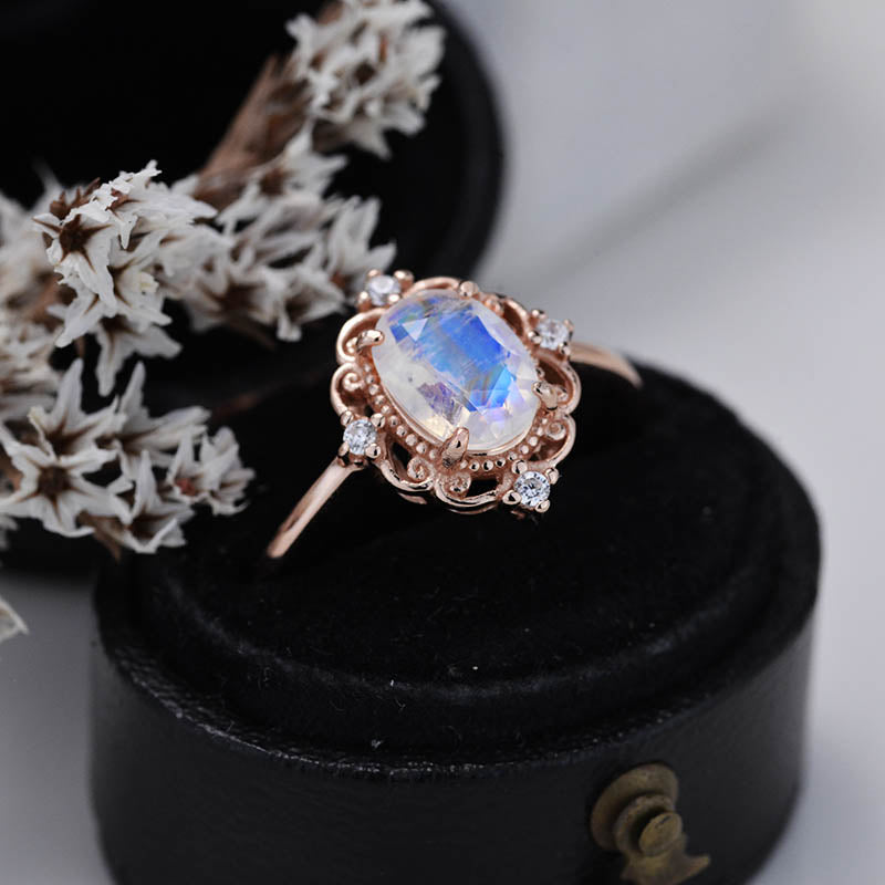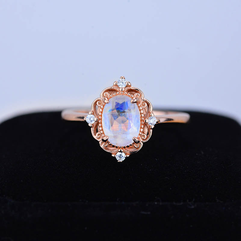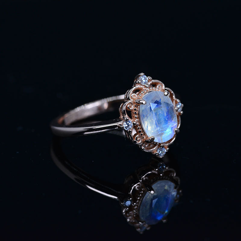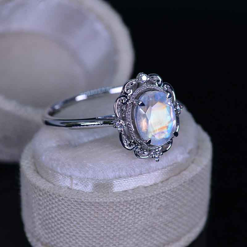 The default design option features 8x6mm Oval Cut Moonstone, VG-Cut, Ex-Polish, VG-Symmetry Set with White Sapphires