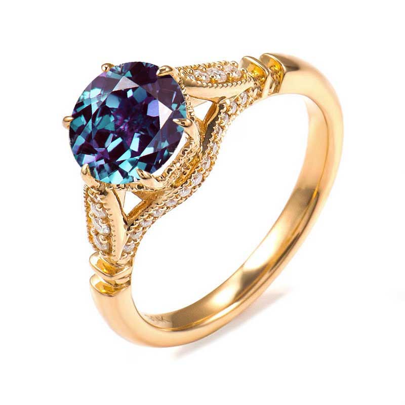14K Solid Yellow Gold 2CT Round Alexandrite Solitaire Six Prongs Ring, Vintage Milgrain Engagement Ring Anniversary Promise Gold Ring