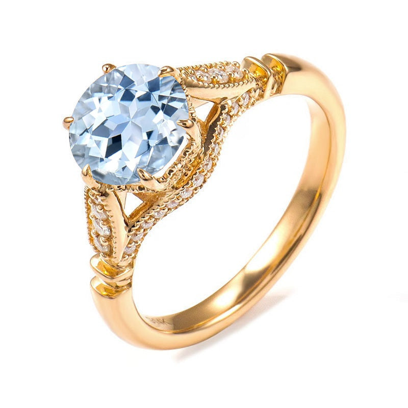 14K Solid Yellow Gold 2CT Round Genuine Natural Aquamarine Solitaire Six Prongs Ring, Vintage Milgrain Engagement Ring Anniversary Promise Gold Ring