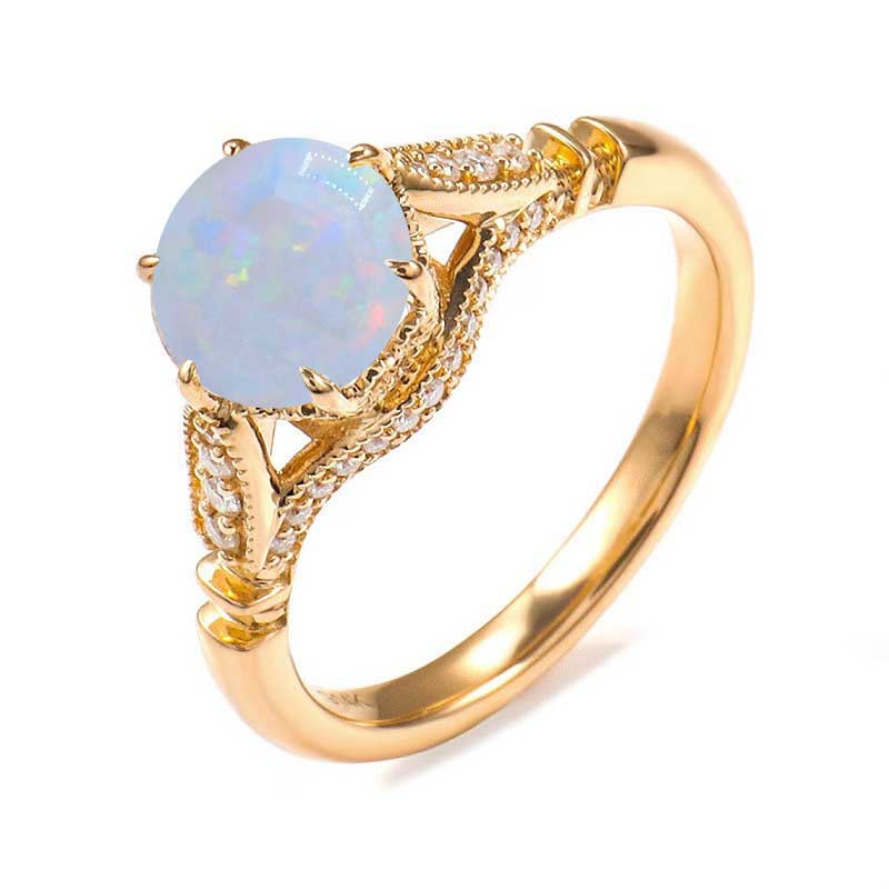 14K Solid Yellow Gold 2CT Round White Opal Six Prongs Ring, Vintage Milgrain Engagement Ring Anniversary Promise Gold Ring