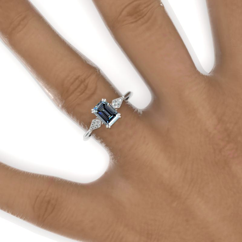 1.5 Carat Gray Moissanite Emerald Cut 7x5mm VVS1-Clarity, VG-Cut, Ex-Polish, VG-Symmetry Center Stone with Colorless 0.4 CTW Moissanite (D-Colorless  VVS1 clarity) Accent Stones 14K White Gold Ring.