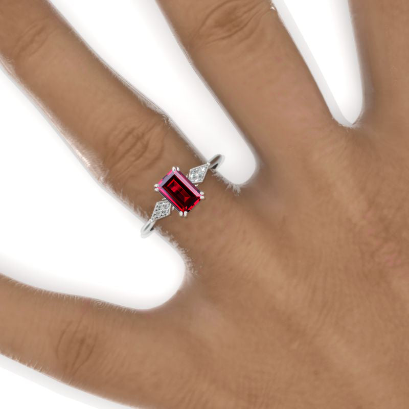 1.5 Carat  Ethically Lab-Grown Ruby AAA+ Grade Emerald Cut 7x5mm VG-Cut, Ex-Polish, VG-Symmetry Center Stone with Colorless 0.4 CTW Moissanite (D-Colorless  VVS1 clarity) Accent Stones 14K White Gold Ring.