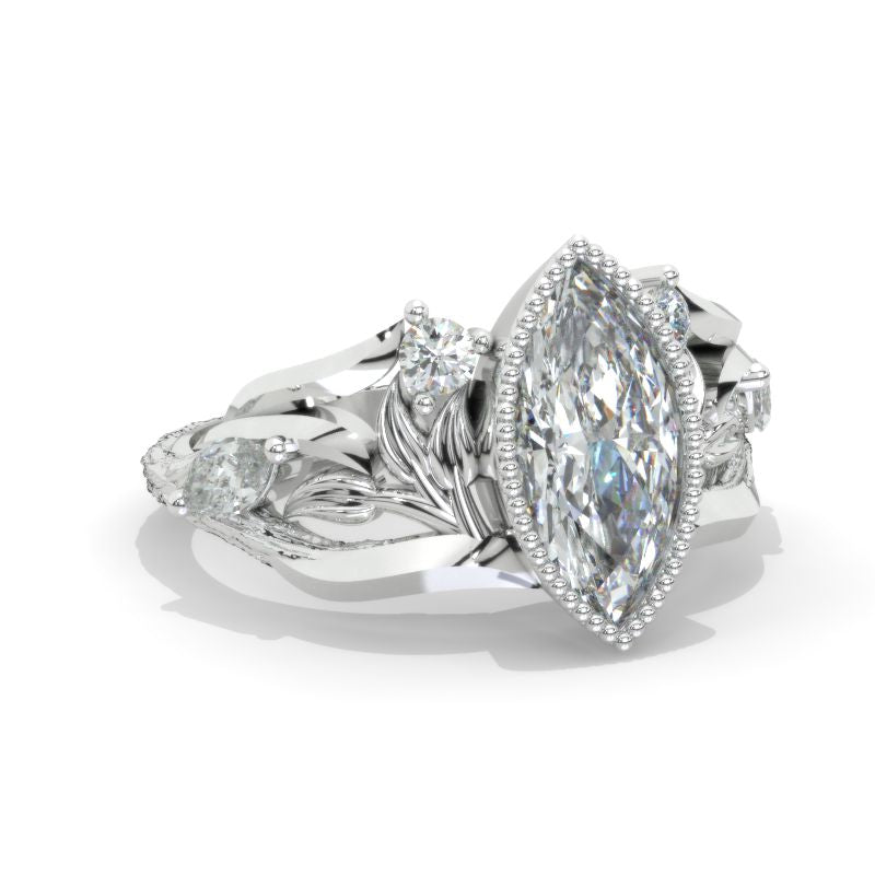 Engagement Ring: Approximately 1.5+ Carat LAB-Grown Diamond Marquise 12x6mm D-Colorless VVS1-Clarity, VG-Cut, Ex-Polish, VG-Symmetry Center Stone set with LAB-Grown Diamond Accents in 14K White Gold Ring.