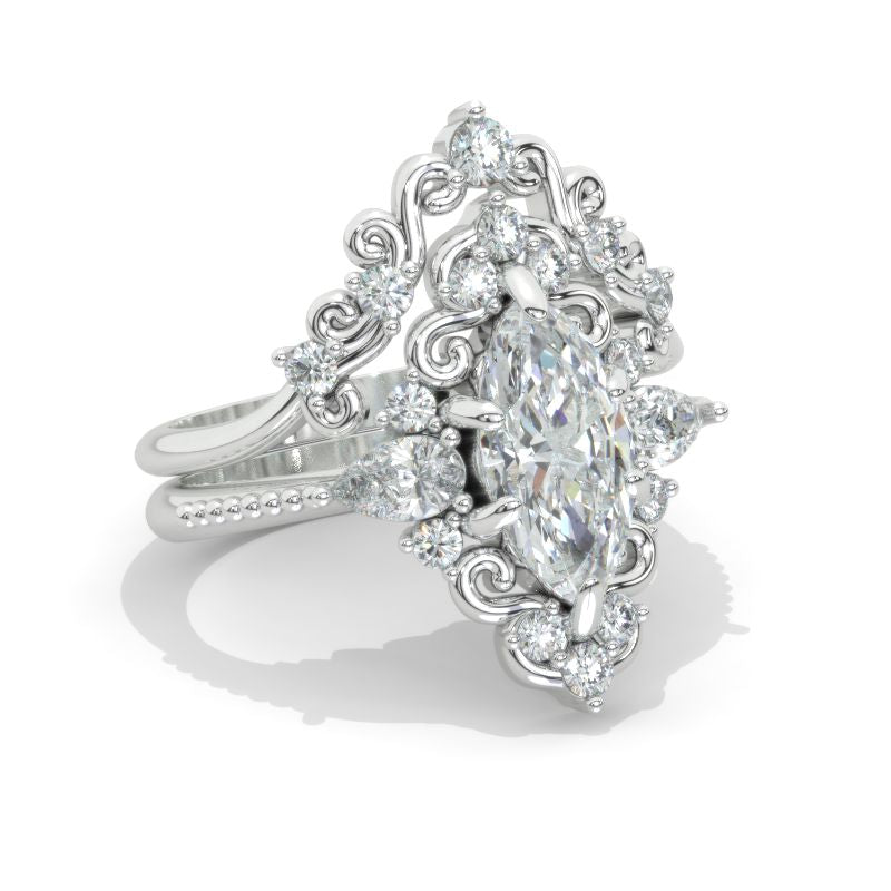Engagement Ring: Approximately 1.5+ Carat LAB-Grown Diamond Marquise 12x6mm D-Colorless VVS1-Clarity, VG-Cut, Ex-Polish, VG-Symmetry Center Stone set with LAB-Grown Diamond Accents in 14K White Gold Ring Set.