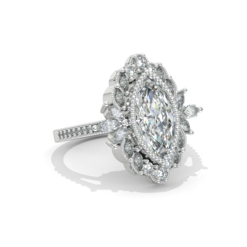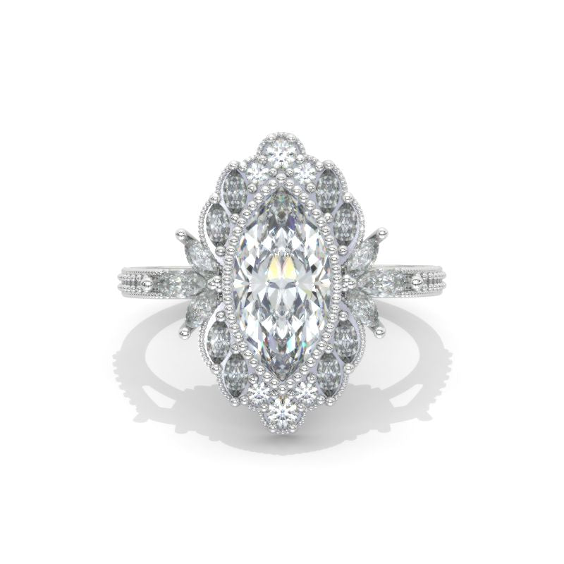 Engagement Ring: Approximately 1.5+ Carat LAB-Grown Diamond Marquise 12x6mm D-Colorless VVS1-Clarity, VG-Cut, Ex-Polish, VG-Symmetry Center Stone with Colorless 0.9 CTW LAB-Grown Diamond