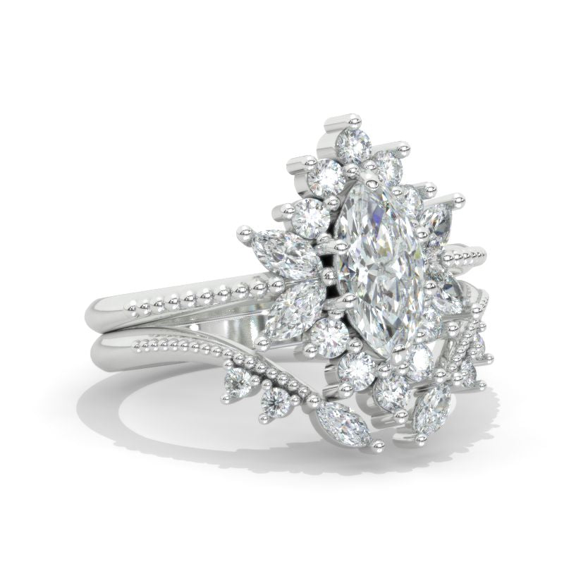 Engagement Ring: Approximately 1.5+ Carat LAB-Grown Diamond Marquise 10x5mm D-Colorless VVS1-Clarity, VG-Cut, Ex-Polish, VG-Symmetry Center Stone with Colorless 0.9 CTW LAB-Grown Diamond