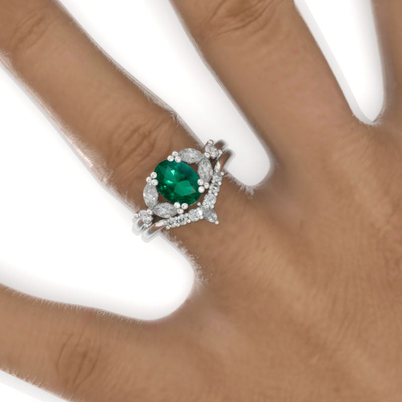 14K White Gold 1.5 Carat Oval Emerald Halo Engagement Ring Eternity Ring Set Model 835-8x6mm set
