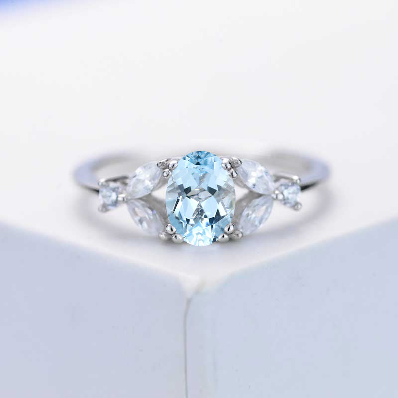 Engagement : 1.9 Carat Giliarto Genuine Natural Aquamarine Oval 8x6 mm VG-Cut, Ex-Polish, VG-Symmetry Center Stone with 4 D-Colorless 0.1 CTW Moissanite