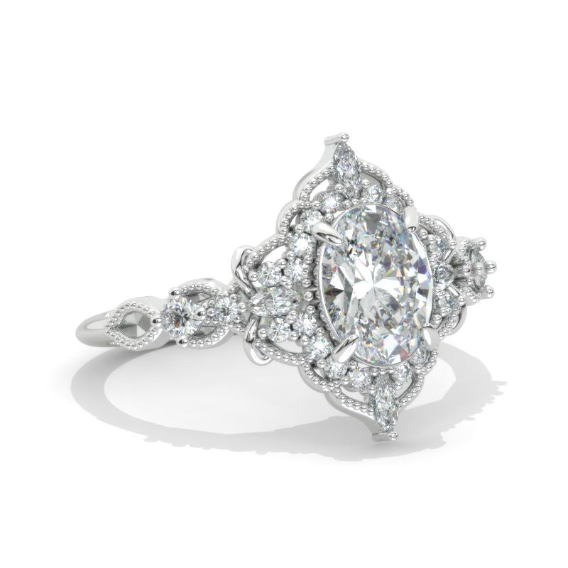 14K White Gold 1.5 Carat Oval Moissanite Halo Floral Shank Engagement Ring Model 1351