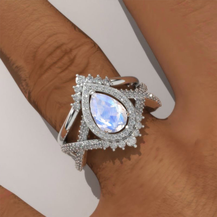 14K White Gold 1.5 Carat Pear Genuine Moonstone Halo Twisted Engagement Ring Eternity Ring Set