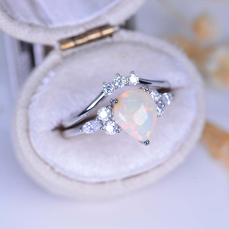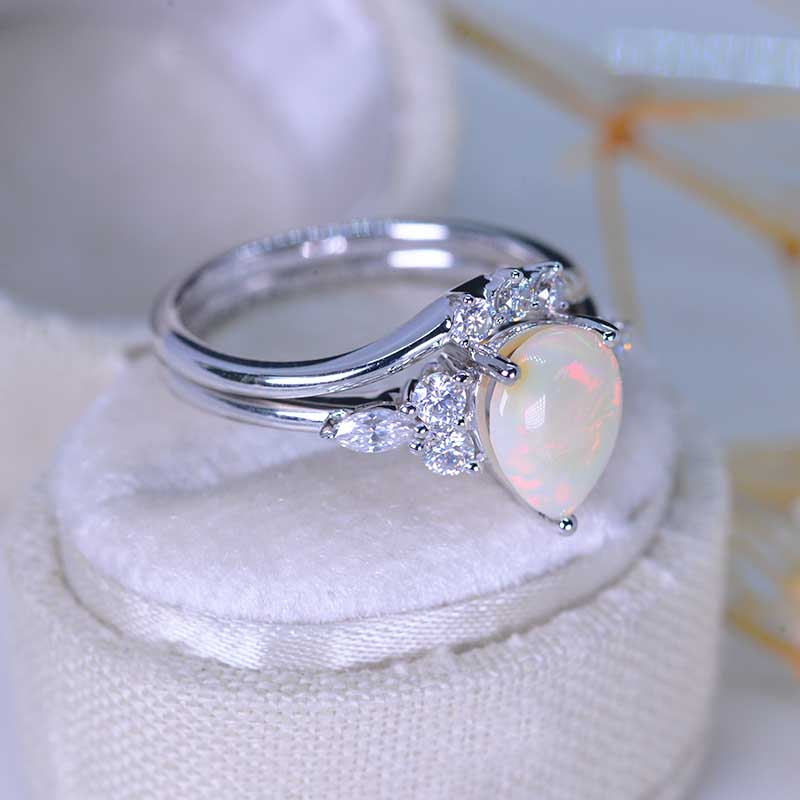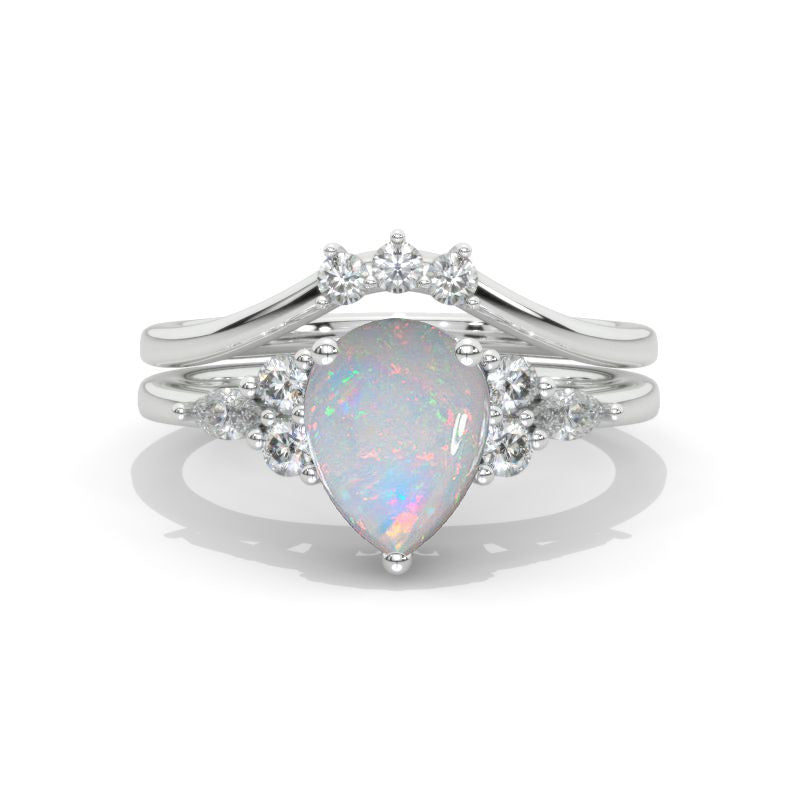 14K White Gold 1.5 Carat Pear Genuine Natural White Opal Engagement Ring. Eternity Ring Set