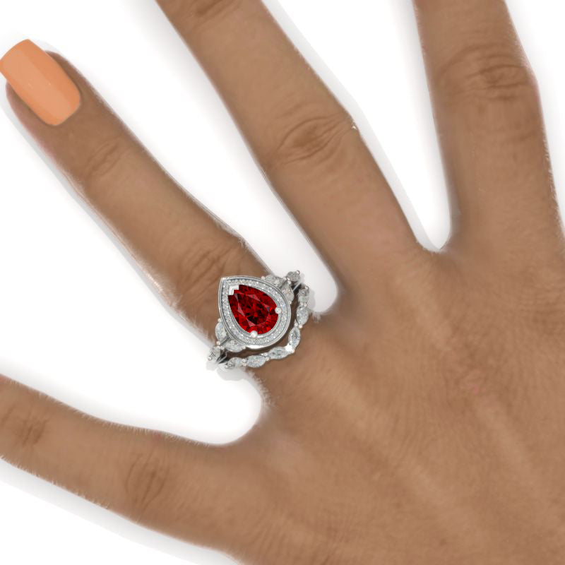 14K White Gold 1.5 Carat Pear Ruby Halo Twisted Engagement Ring Eternity Ring Set