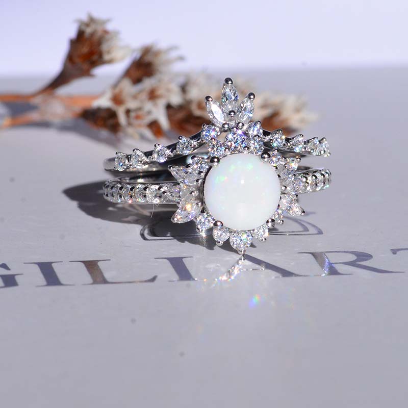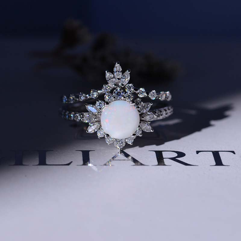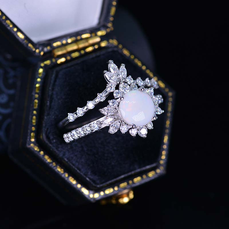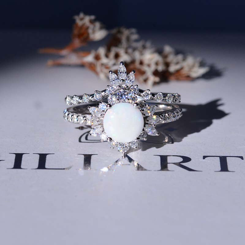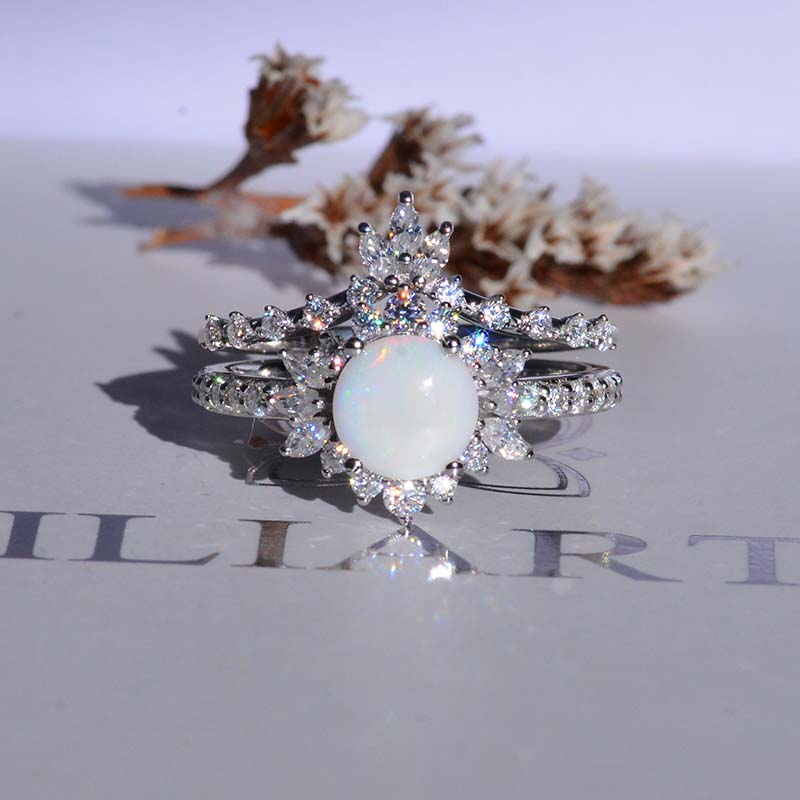 14K White Gold 1.5 CTW Genuine Natural White Opal Halo Engagement Ring Eternity Fairy Tail Ring Set