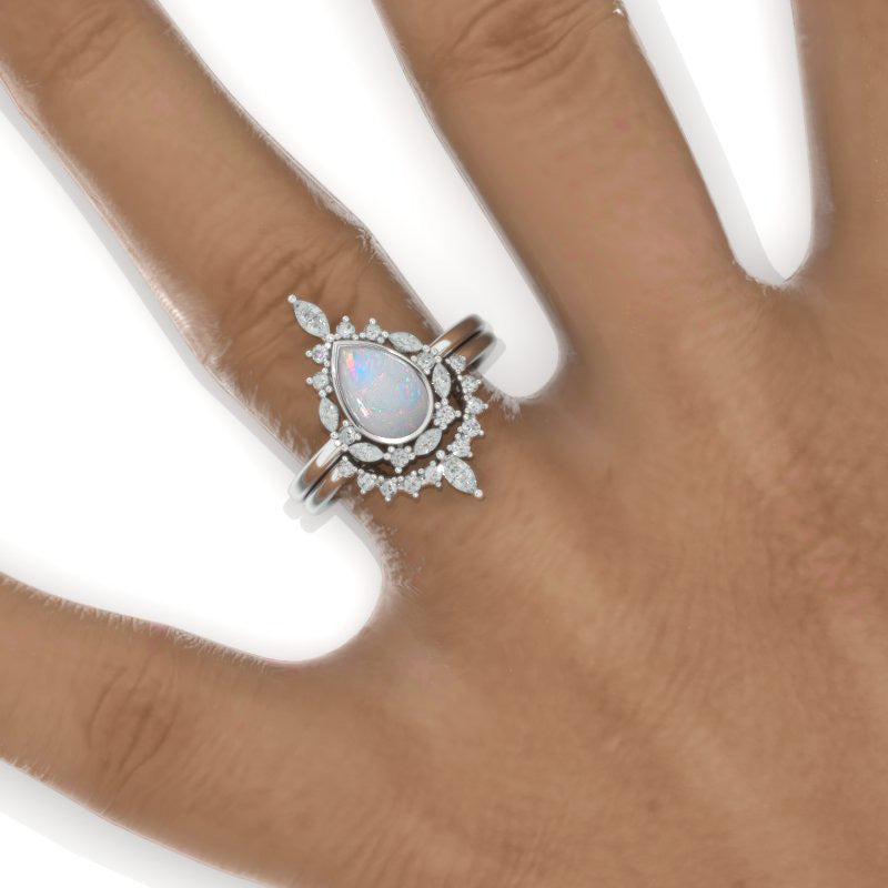 14K White Gold 1.9 Carat Pear Genuine Natural White Opal Halo Engagement Ring Eternity Ring Set