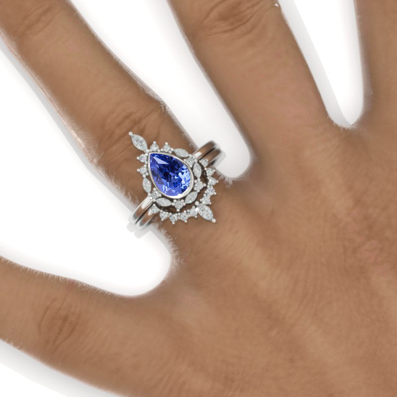 14K White Gold 1.9 Carat Pear Natural Genuine Tanzanite Halo Engagement Ring Eternity Ring Set