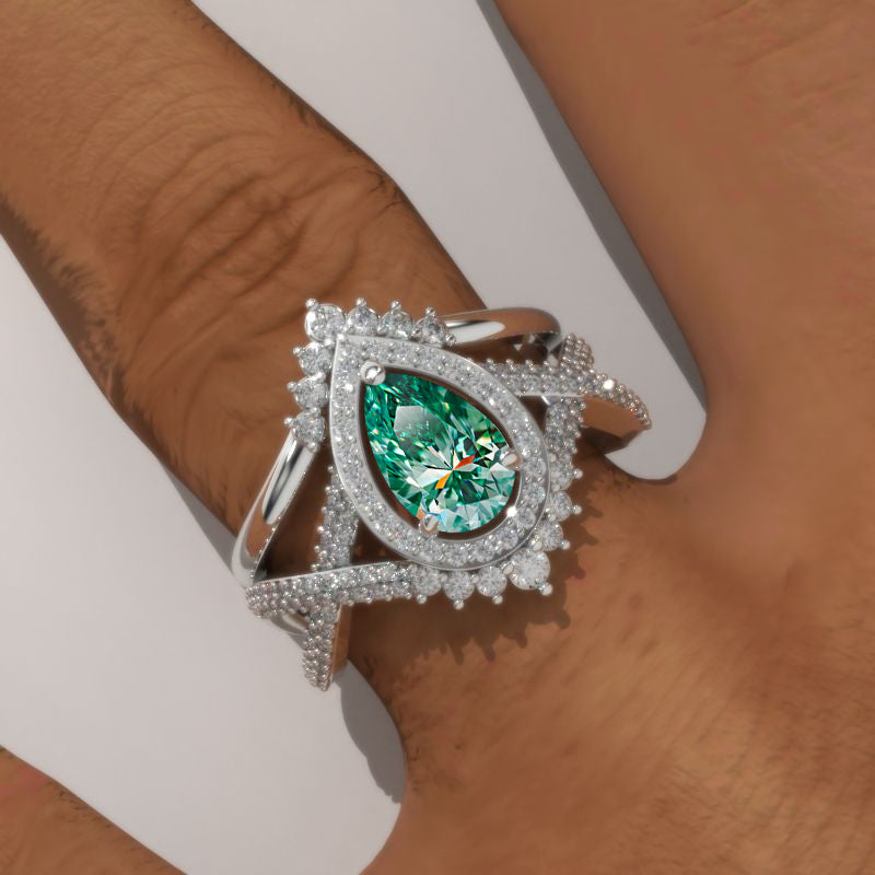 Engagement Ring Approximately 1 Carat Giliarto Green Moissanite Pear 8x6mm Green Color, VVS1-Clarity, VG-Cut, Ex-Polish, VG-Symmetry Center Stone with 124 Colorless
