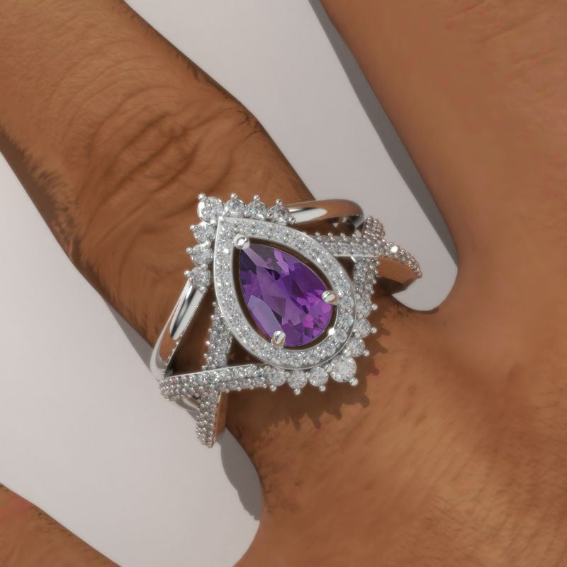 14K White Gold 1 Carat Pear Natural Amethyst Halo Twisted Engagement R - Giliarto