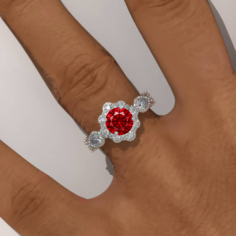1 Carat Ethically Lab-Grown Ruby AAA+ Grade Round  6mm VG-Cut, Ex-Polish, VG-Symmetry Center Stone with 30 Colorless 0.8 CTW Moissanite (D-Colorless VVS1 clarity) Accent Stones 14K White  Gold  Ring.