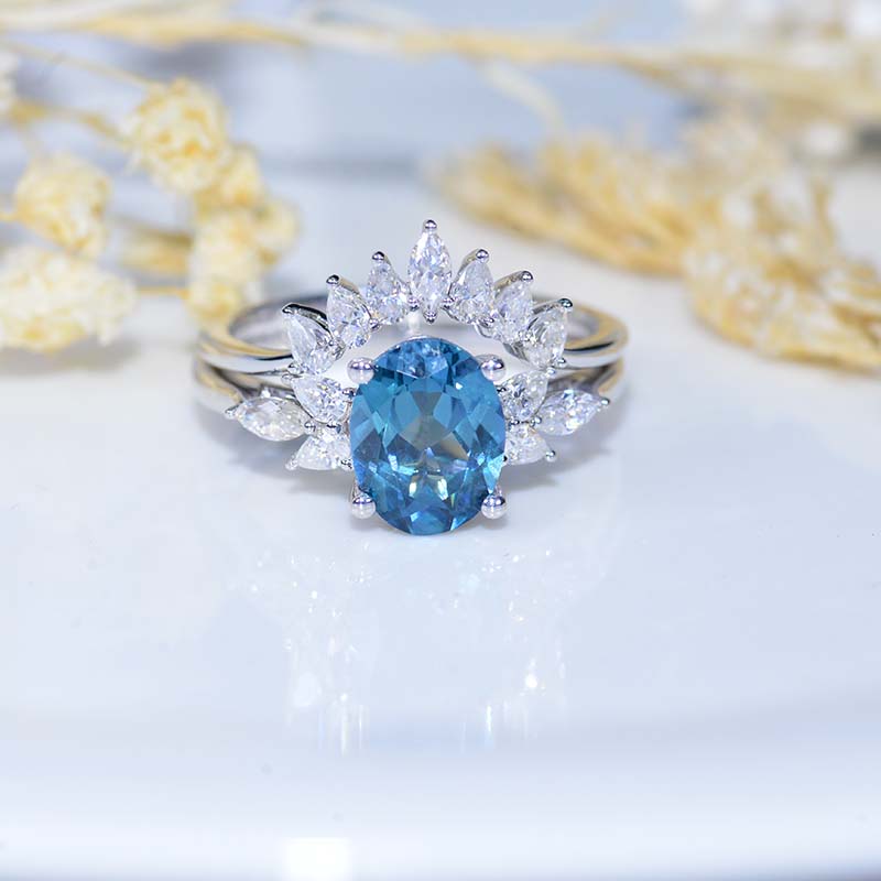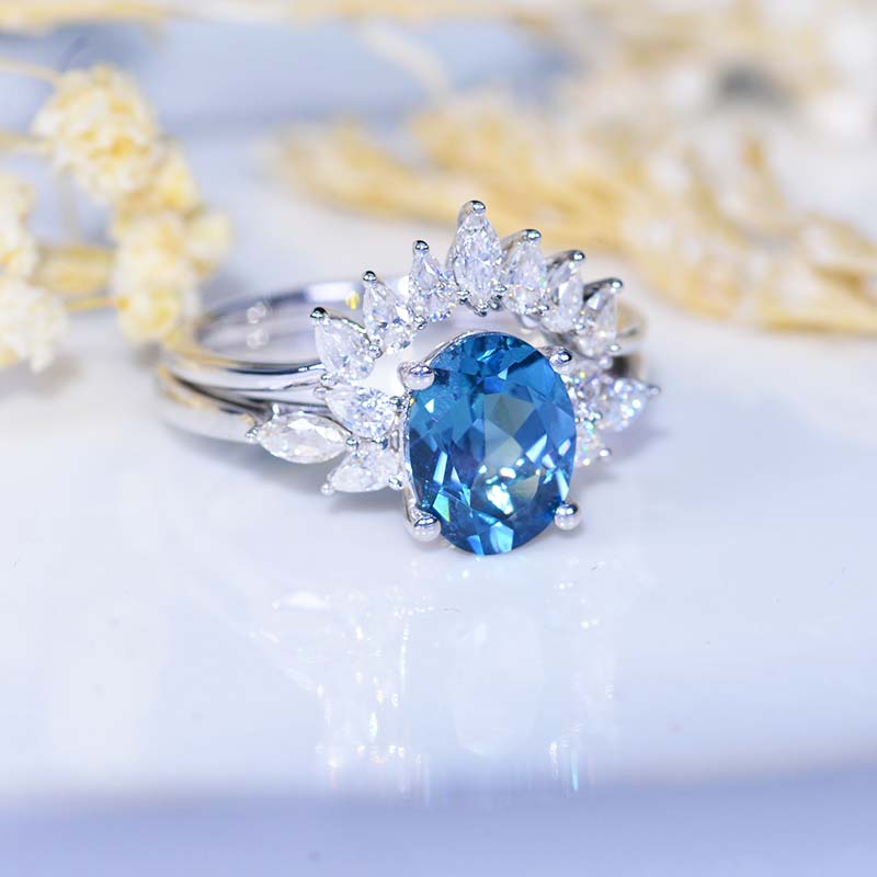 14K White Gold 2.5 Carat Oval Teal Sapphire Halo Engagement Ring, Eternity Ring Set