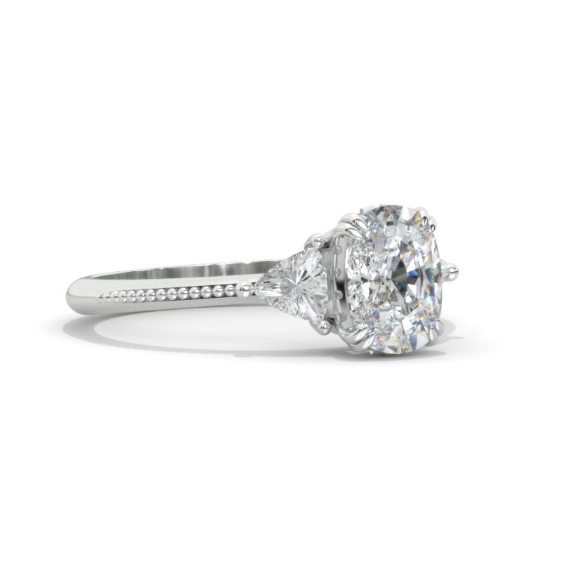 1.5 Carat Moissanite Cushion 8x6mm D-Colorless VVS1-Clarity, VG-Cut, Ex-Polish, VG-Symmetry Center Stone with Colorless 0.8 CTW Moissanite (D-Colorless VVS1 clarity) Accent Stones 14K White Gold Ring.