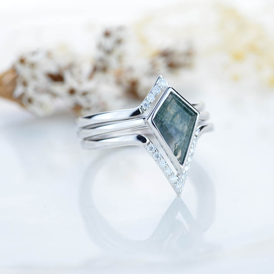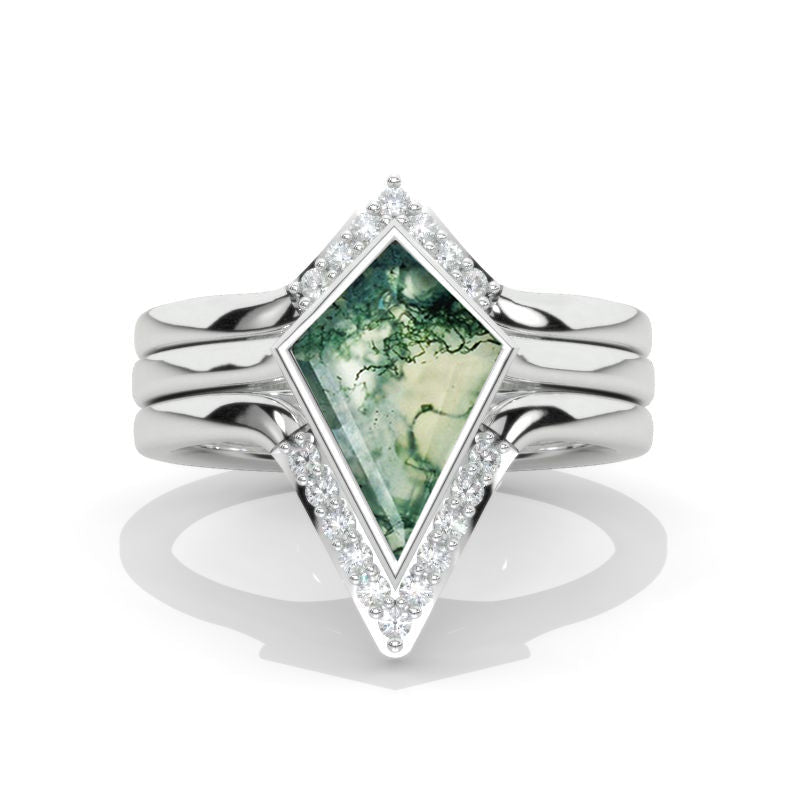 14K White Gold 2 Carat Kite Moss Agate Halo Engagement Ring, Three Rin - Giliarto