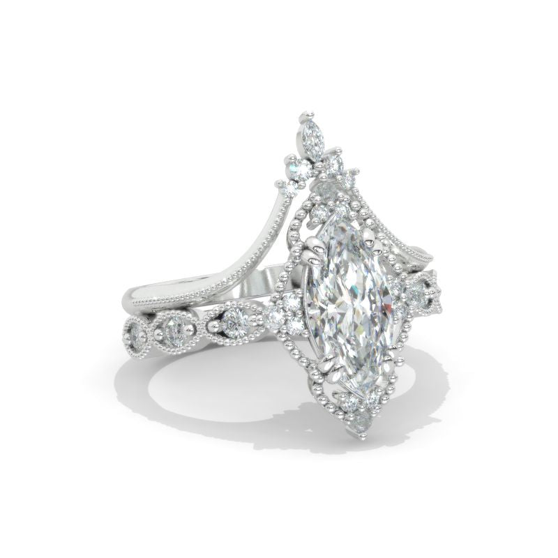 Engagement Ring: 1.5 Carat Giliarto Moissanite Marquise 10x5mm D-Colorless VVS1-Clarity, VG-Cut, Ex-Polish, VG-Symmetry Center Stone with Colorless 0.9 CTW Moissanite