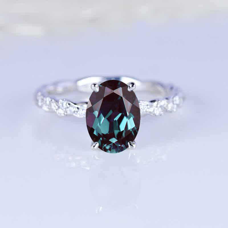 Engagement Ring: 2 Carat Ethically LAB-Grown Alexandrite Oval 9x7 mm  VG-Cut, Ex-Polish, VG-Symmetry Center Stone with 18 Colorless 0.4 CTW Moissanite