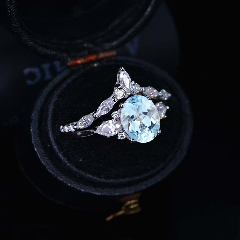 14K White Gold 2 Carat Oval Aquamarine Halo Engagement Ring, Unique Eternity Ring Set