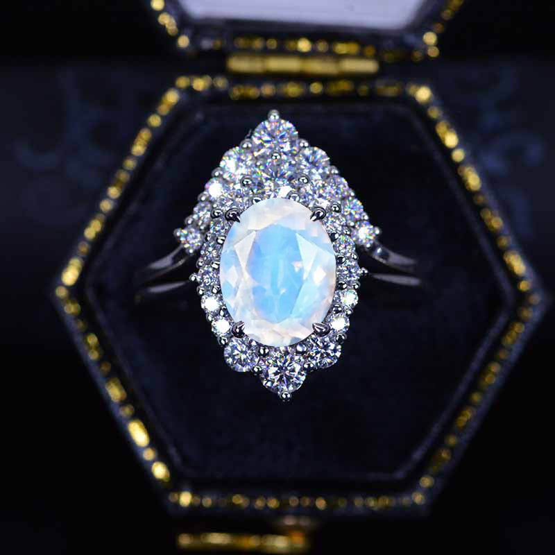 2 Carat Genuine Moonstone Oval 9x7mm VVS1-Clarity, VG-Cut, Ex-Polish, VG-Symmetry Center Stone with 18 D-Colorless 0.8 CTW Moissanite (D-Colorless, VVS1 clarity) Accent Stones 14K White Gold Ring.