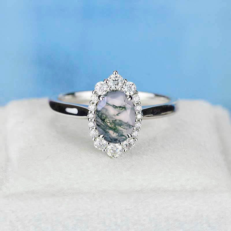 14K White Gold 2 Carat Oval Genuine Moss Agate Halo Engagement Ring Mo - Giliarto