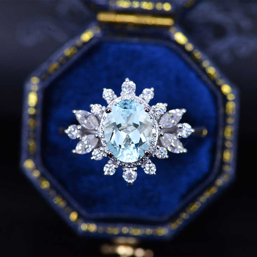Engagement Ring :  Genuine Natural Aquamarine Oval 9x7 mm, VG-Cut, Ex-Polish, VG-Symmetry Center Stone with 38 Colorless 0.9 CTW Moissanite