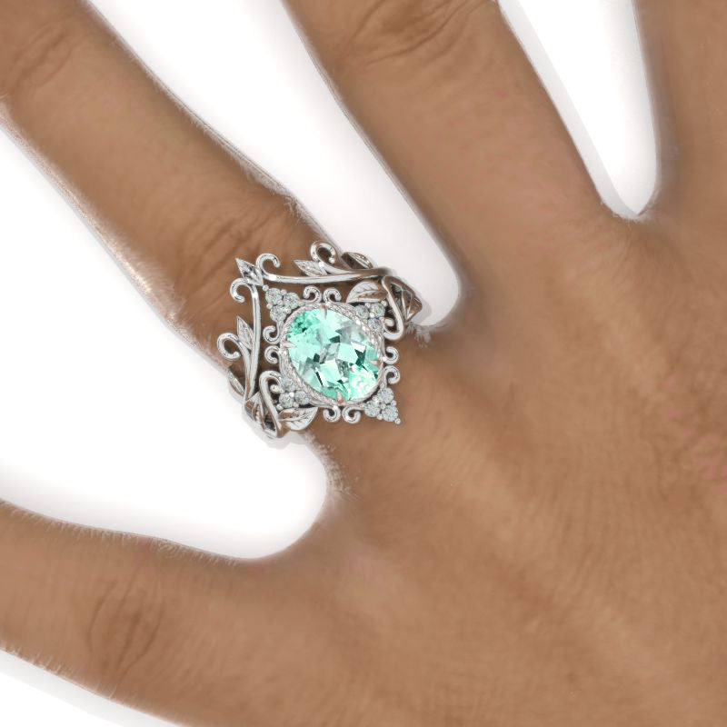14K White Gold 2 Carat Oval Mint Sapphire Engagement Ring Unique Floral Ring Set
