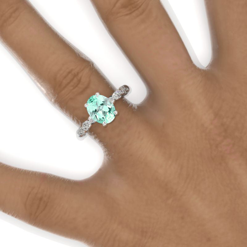 Engagement Ring: 2 Carat Ethically Lab-Grown Mint Sapphire Oval 9x7mm Mint-Color VG-Cut, Ex-Polish, VG-Symmetry Center Stone with 18 Colorless 0.4 CTW Moissanite