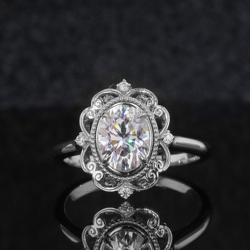 2 Carat D-Colorless Moissanite Oval 9x7mm  VVS1-Clarity, VG-Cut, Ex-Polish, VG-Symmetry Center Stone with D-Colorless 0.1 CTW Moissanite (D-Colorless, VVS1-Clarity) Accent Stones 14K Rose Gold Ring.